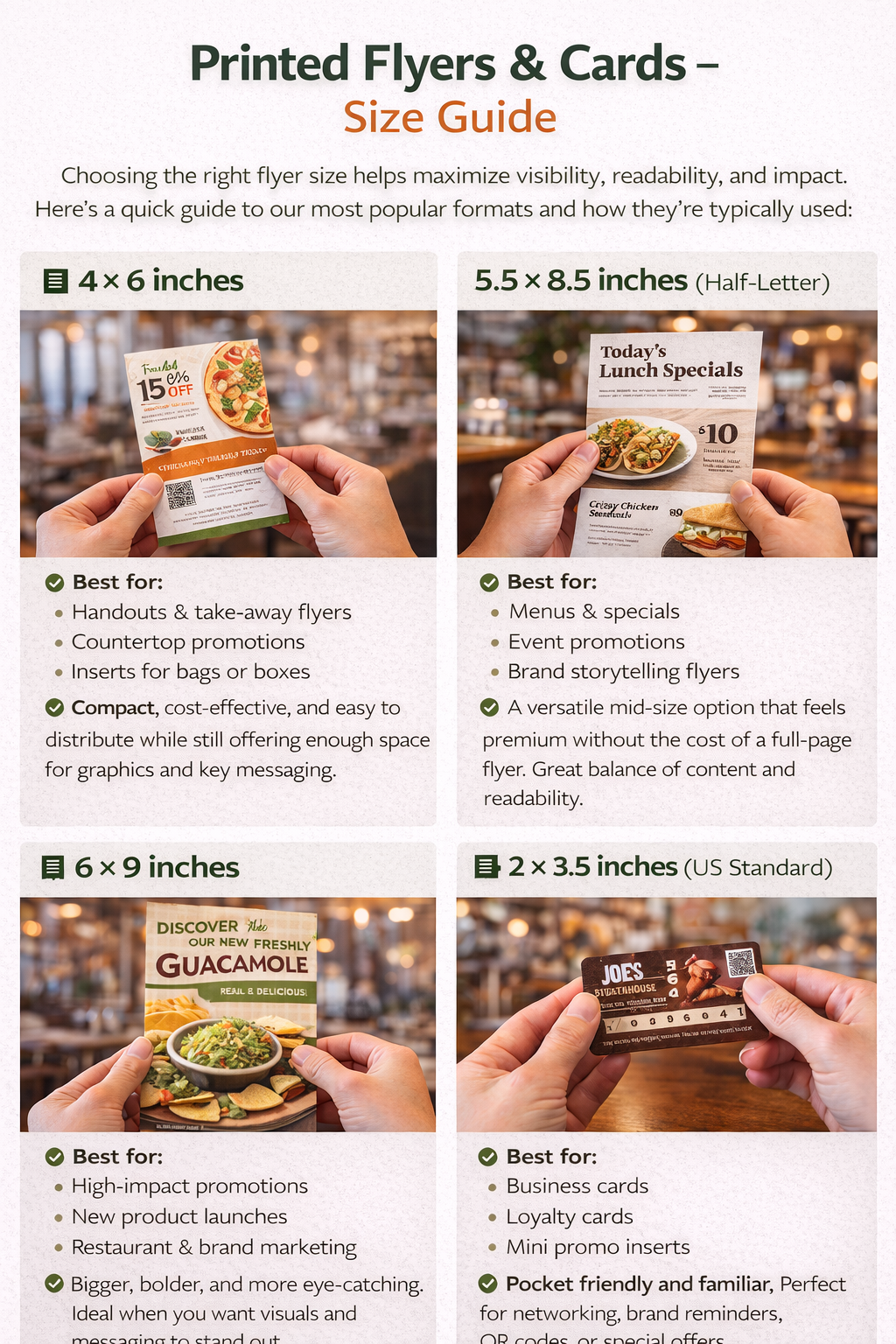 Flyers designed to promote your brand, events, or special offers. Printed in full-color CMYK on premium paper stock for strong visual impact.